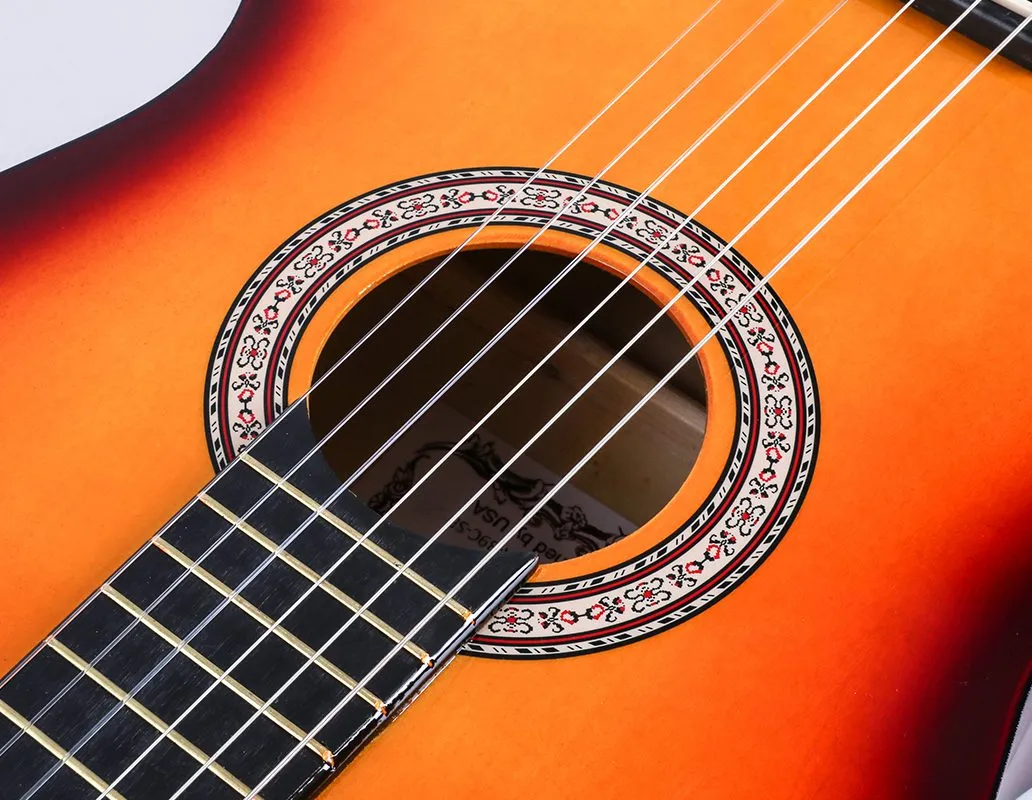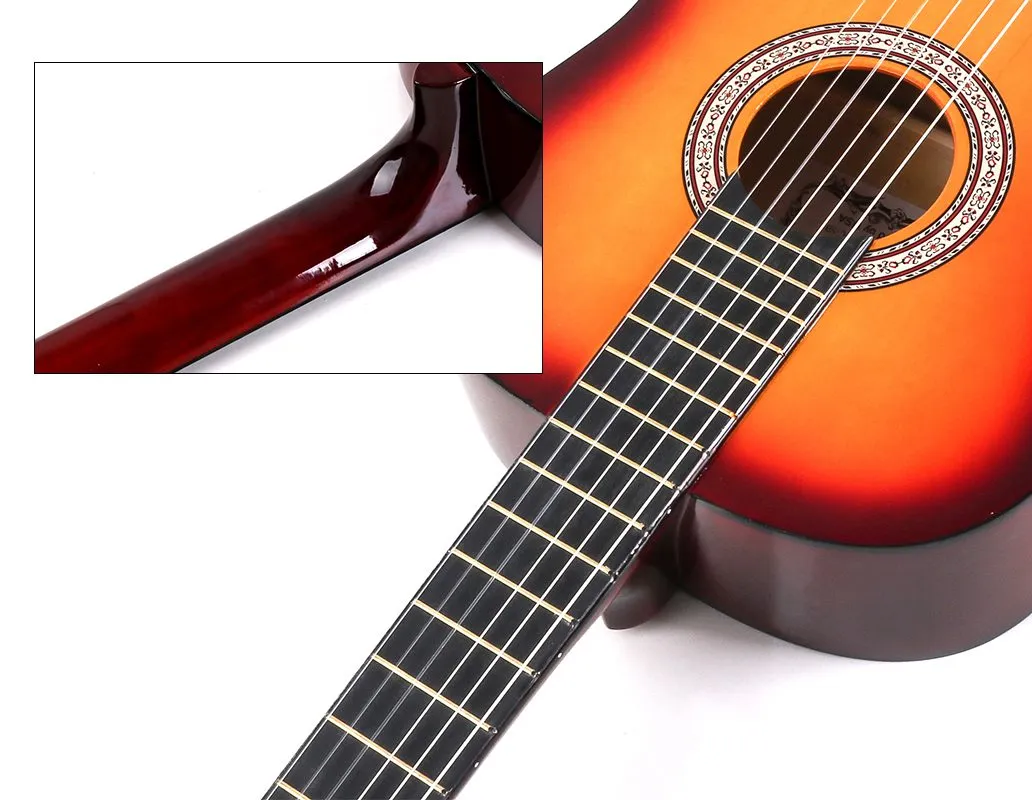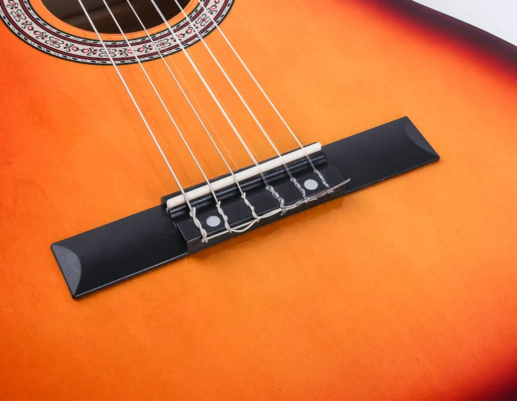 This 39-inch classical guitar, with its unique design and high-quality materials, brings you an extraordinary musical experience. The body and neck are made of basswood, a wood with a uniform texture, which gives the guitar a stable structure and excellent acoustic performance, making the sound full and full of charm. The plastic fingerboard is sturdy and durable, providing reliable support for your performance. The technical wood bridge ensures the uniform transmission of string tension, further optimizing the sound quality. The ABS nut effectively reduces the vibration loss of the strings, making the tone clearer and brighter. The glossy paint makes the whole guitar radiant, whether on stage or in daily practice, it can attract everyone’s attention. It is not only an instrument, but also a close partner in your musical journey. Whether you are a novice to the music hall or an experienced player, this guitar can meet your needs and accompany you to play moving melodies and write your own musical chapter.