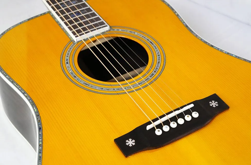 | Top: Solid spruce as the top material for folk guitars offers unparalleled advantages. Its acoustic properties are truly exceptional. Lightweight yet highly elastic, it efficiently converts the vibrations of the strings into sound. When played, it endows the folk guitar with a bright and clear tone. The high frequencies are as transparent and crisp as the ringing of a silver bell, capable of precisely capturing the slightest nuances of plucking. The low frequencies are deep and powerful, laying a solid foundation for the music, and bringing rich layers and outstanding dynamic response, making every note brimming with vitality.In terms of durability, solid spruce has a moderate hardness and strong resistance to deformation, allowing it to withstand prolonged use and playing. As time passes, the wood gradually “opens up,” and the tone becomes increasingly rich and enchanting. In terms of playing adaptability, folk guitars with solid spruce tops are suitable for a variety of playing styles. Whether it’s the gentle and soothing lyrical folk music or the lively and rhythmic strumming and singing, they can be perfectly interpreted. Moreover, the naturally beautiful grain of solid spruce enhances the guitar’s aesthetic appeal, giving it both practical value and ornamental value. With these advantages, solid spruce has become the top choice for the tops of many high-quality folk guitars. |