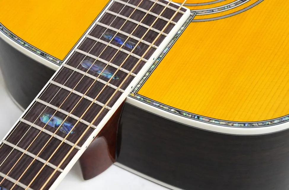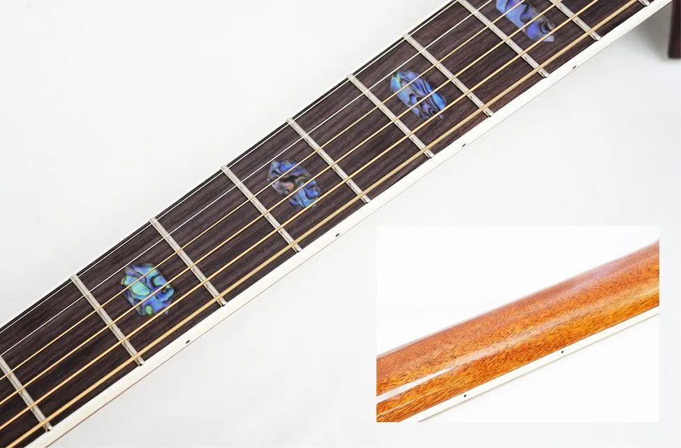Binding: In the construction of folk guitars, the combination of ABS binding and mother-of-pearl inlay offers both practicality and aesthetic appeal. Thanks to its high strength and impact resistance, ABS binding effectively protects the edges of the guitar from bumps and abrasions. Whether during daily use, transportation, or accidental impacts, it serves as a robust protective barrier, extending the lifespan of the instrument. Additionally, ABS is highly corrosion-resistant, shielding the wood from environmental factors such as moisture and dust, thereby maintaining the guitar’s appearance and structural integrity.The addition of mother-of-pearl inlay adds a unique artistic charm to the guitar. With its warm luster and delicate texture, the natural shell material emits a soft glow when illuminated. Paired with the ABS binding, it creates a striking yet harmonious visual contrast, enhancing the guitar’s appearance with a sense of depth and sophistication. Moreover, the patterns formed by the mother-of-pearl inlay are not merely decorative; they also provide visual cues during performance, assisting players in better positioning the guitar and improving the overall playing experience. The synergy between ABS binding and mother-of-pearl inlay ensures both the durability of the folk guitar and endows it with an elegant and luxurious charm, making the instrument a perfect blend of practicality and artistry. |