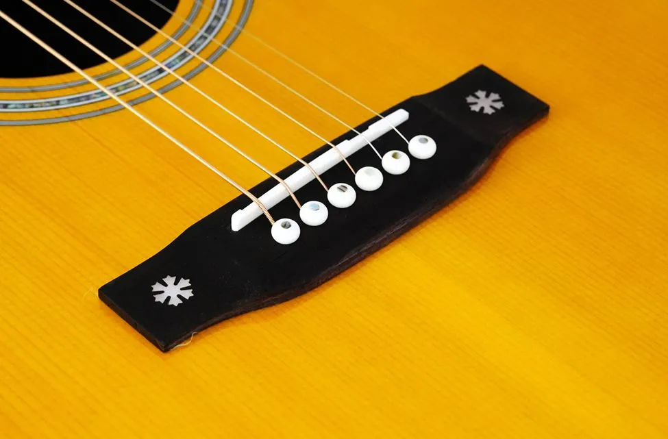 | Nut/Bridge: The bone nut and rosewood bridge are crucial to the tone and stability of a folk guitar. With its excellent acoustic conductivity, the bone nut efficiently transfers the vibrations of the strings to the guitar’s top, minimizing energy loss and producing a purer, fuller, and more resonant tone. Moreover, bone is hard and wear-resistant. Its smooth surface effectively reduces friction between the strings and the nut, minimizing string slippage and ensuring pitch stability. This allows players to focus on musical expression without the need for frequent tuning. Additionally, the natural properties of bone add a warm quality to the guitar’s tone, enhancing its emotional expressiveness.The rosewood bridge provides a solid foundation for both the tone and structural stability of the guitar. With its high density and sturdy texture, rosewood securely holds the strings in place, ensuring consistent string tension and a more balanced, sustained tone. Its superior resonance transmission capabilities effectively convey the vibrations of the strings to the top, enhancing the guitar’s overall resonance, resulting in deeper, richer bass and clear, bright mid and high frequencies. Furthermore, rosewood’s durability enables it to withstand the long-term tension of the strings, remaining resistant to deformation and damage. This provides the guitar with stable structural support and extends the instrument’s lifespan. The combination of a bone nut and rosewood bridge elevates the folk guitar to a higher level in both tone and performance. |