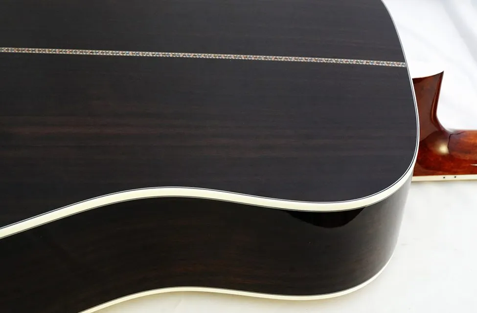 Back and Sides: Solid rosewood used as the back and side panels of a folk guitar endows the instrument with an irreplaceable and unique charm. In terms of acoustic properties, rosewood is highly dense and hard, effectively suppressing unwanted vibrations and shaping warm, rich, and multi-layered tones. Its low frequencies are deep and full, reminiscent of the rich sound of a double bass, injecting a sense of stability and strength into melodies. The mid frequencies are smooth and warm, perfectly highlighting vocals or melodic lines, while the high frequencies are clear and pleasing to the ear. The harmonious blend of these three frequency ranges provides a balanced and enchanting auditory experience. Whether for solo performances or accompanying vocals, the guitar demonstrates outstanding expressive power.Regarding durability, rosewood is resistant to corrosion and wear, capable of withstanding prolonged use and environmental changes, offering stable structural support to the guitar. Its natural and distinctive grain patterns, with deep and varied hues, present an elegant and noble texture after meticulous sanding and finishing, significantly enhancing the guitar’s artistic appeal. Moreover, folk guitars with solid rosewood back and side panels perform admirably across diverse musical styles. Whether it’s the narrative charm of folk music or the dynamic rhythm of rock, they can convey unique musical emotions through their exceptional tone, making them an ideal choice for music enthusiasts who pursue high-quality sound and tactile sensations. |